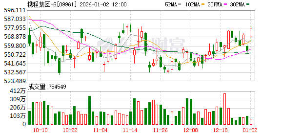 消息面上,中国交通运输部最新发布的数据显示,2025年12月31日,元旦假期前一天,全社会跨区域人 员流动量20776.3万人次,环比增长33.7%,同比增长25.4%。1月1日,预计全社会跨区域人员流动量 20813万人次,环比增长0.2%,同比增长21%。 国信证券发布研报称,展望后续,旅游需求预计整体仍将稳健释放,携程凭借完善的产品供给与优质服 务,国内主站基本盘稳健且护城河深厚,份额还在持续增加,利润率有望逐步优化。同时把握出海发展 窗口期及入境政策红利,国际平台以规模为先战略下保持较快扩张,已经逐步在多个区域得到验证,带 动总体收入维持15%以上增速;此外公司大额回购计划与常规股息安排彰显股东回报端积极姿态。 智通财经APP获悉,携程集团-S(09961)盘中涨近5%,截至发稿,涨4.33%,报578港元,成交额4.24亿 港元。 ...