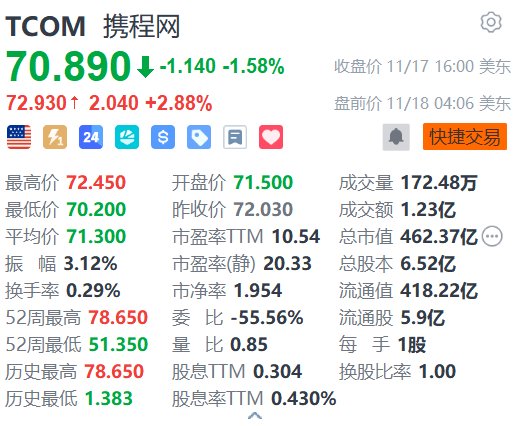 美股异动丨携程网盘前涨近3% 绩后获花旗看好