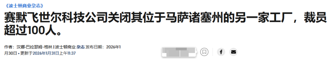赛默飞世尔是马萨诸塞州最大的医疗器械公司,全球雇员约12.5万人,其中在马萨诸塞州拥有4100名员工。根据公司向州政府提交的通知及发言人对《商 业杂志》的说明,工厂关闭将是一个渐进过程,预计在2026年底前完成。相应的裁员计划将于2026年12月31日启动,并可能持续至2027年。 公司发言人表示,此次调整是"持续评估全球运营、优化效率以更好满足客户需求"的一部分,并强调"任何影响同事的决定都绝非轻率之举"。发言人指 出,此举旨在增强全球竞争力,且不改变公司对"美国制造"的承诺。 2026年1月29日,赛默飞世尔科技公司发布业绩预警,称其年度利润低于预期,同时警告美国学术研究经费持续削减带来的压力将延续至2026年,导致客 户态度趋于谨慎。 在此财务与市场背景下,赛默飞世尔科技宣布了一系列运营调整措施。公司确认将逐步关闭位于马萨诸塞州富兰克林(27 Forge Parkway)的一家工厂, 并裁员103人。该工厂主要用于生产制造与办公,其业务将转移至公司在美国的其他生产基地。 2026年1月29日,赛默飞世尔科技公司发布业绩预警,称其年度利润低于预期,同时警告美国学术研究经费持续削减带来的压力将延续至2026 ...