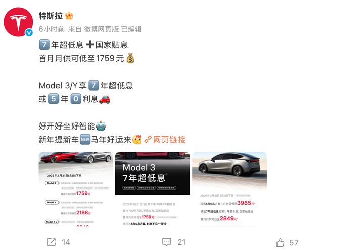 汽车市场的降价步伐仍未停歇。近期打算入手特斯拉的消费者,或许能捡到实惠。 2月26日,特斯拉中国官宣新一轮购车金融政策:3月31日前下单,全系车型可享7年超低息贷款。其中,Model 3、Model Y及Model Y L三款主力车型还提供 5年0息方案,用户购车无需支付任何利息。 1月6日,特斯拉官微发布消息称,特斯拉Model 3/Y/Y L推出7年超低息购车方案。其中,Model 3/Y首付7.99万元起,月供可低至1918元;Model Y L首付 9.99万元起,月供可低至2947元。特斯拉还表示,Model Y L首次推出5年0息,首付9.99万元起,月供可低至3985元。 明明没官宣降价,却推出门槛极低的贷款方案,此举被业内解读为新一轮"变相降价",核心逻辑在于应对销量增长压力。 数据显示,特斯拉中国2025年批发销量(含出口)为85.17万辆,同比下降7.08%。 今年2月初,针对特斯拉在华市场销量下滑的现状,特斯拉全球副总裁陶琳对外回应称,这主要是由于产品迭代导致的阶段性产能受限。 来源:新浪微博 今年连推两波超低息促销 应对销量下滑的"变相降价"? 具体来看,Model 3首付低至7.99 ...