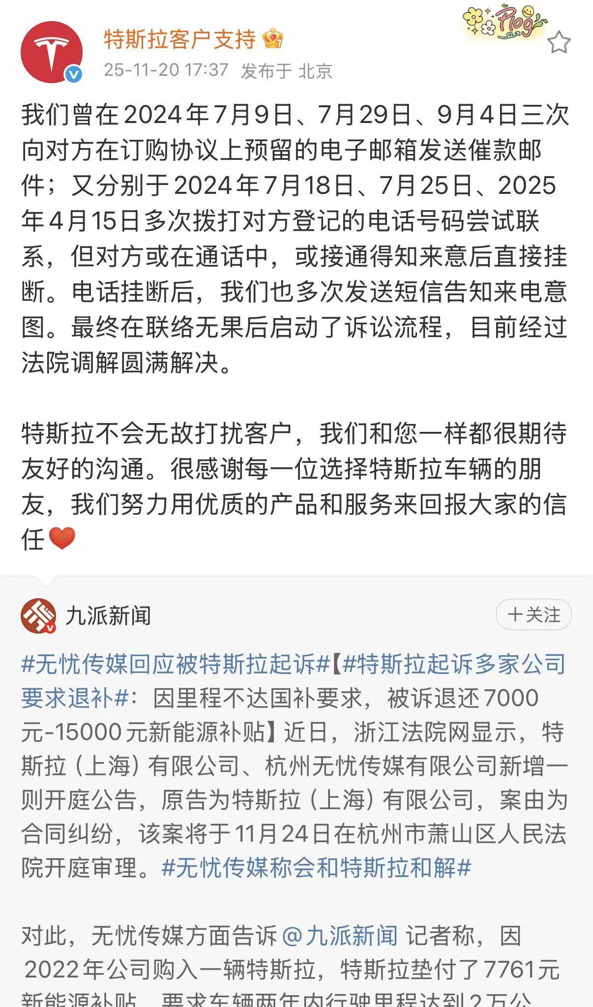 爱企查显示,特斯拉(上海)有限公司起诉杭州无忧传媒有限公司的合同纠纷案件,将于11月24日在杭 州市萧山区人民法院开庭审理。这是特斯拉自2025年7月以来发起的第30余起同类诉讼,被告企业遍布 广东、浙江、江苏、山东、湖南等地,涉及建筑、制造等多个领域。 对于特斯拉的起诉,无忧传媒方面回应称,2022年公司购入特斯拉车辆时,特斯拉垫付7761元国家新能 源补贴,合同约定车辆需在两年内行驶满2万公里,以满足补贴申领条件。因实际行驶里程未达标,特 斯拉未能从政府获得对应补贴,故要求退还该笔款项,未进行公司层面沟通便直接起诉。 "目前我们将与对方和解,退付相关款项。"无忧传媒表示。 其他涉案企业亦给出相似回应。上海市、深圳市、嘉兴市多家企业证实,其被起诉原因均为购车后两年 内行驶里程未达国补要求,特斯拉方面的索赔金额在7000元至15000元之间。其中一家企业负责人向媒 体透露,已通过庭前调解与特斯拉达成和解,退还金额略有降低。 这并非特斯拉首次追讨新能源补贴。据报道,2022年6月,已有部分特斯拉用户收到补交款项通知,原 因同样是行驶里程未达标导致补贴无法申领。 特斯拉中国相关负责人当时曾明确,客户购车时享受的国 ...