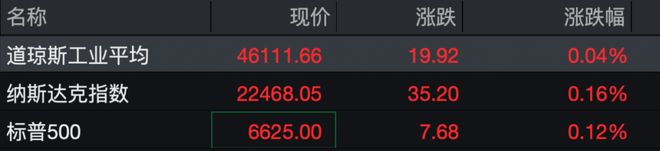 中概股涨跌不一,亚玛芬体育、富途控股涨超2%,阿特斯太阳能跌逾4%。 | 名称 | 现价 | 涨跌 | 涨跌幅 | | --- | --- | --- | --- | | 道琼斯工业平均 | 46111.66 | 19.92 | 0.04% | | 纳斯达克指数 | 22468.05 | 35.20 | 0.16% | | 标普500 | 6625.00 | 7.68 | 0.12% | 大型科技股多数上涨,英伟达涨近2%,谷歌、特斯拉涨超1%。 11月19日,美股开盘三大指数小幅上涨,截至发稿,道指涨0.04%,纳指涨0.16%,标普500指数涨 0.12%。 编辑 | 钉钉 ...