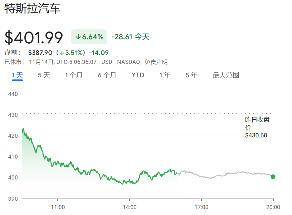 格隆汇11月14日|美股部分明星股盘前大幅走低,英伟达盘前跌3.3%,谷歌跌2.7%,博通跌2.5%,台 积电跌3.4%,特斯拉跌5%。 ...