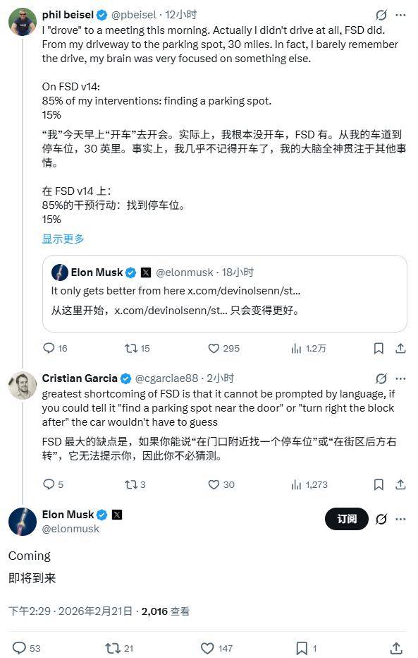 该用户表示,他今早"开车"去参加一场会议,从自家车道到目的地停车位,全程约 30 英里(IT之家 注:约 48.3 公里)路程均由 FSD 驾驶,自己几乎未进行主动干预。据称,由于其在行驶过程中注意力 主要集中在其他事务上,几乎已经忘了自己在开车这件事。 该用户同时对 FSD v14 版本的人工干预情况进行了说明。他表示,约 85% 的干预发生在寻找停车位阶 段,另有约 15% 的干预源于希望车辆选择不同路线。 另一名用户在评论区指出,当前 FSD 系统的主要不足在于无法通过自然语言下达指令,例如直接告诉 车辆"在靠近入口处寻找停车位"或"在下一个街区后右转"等。如果能够通过语言明确意图,车辆在路线 选择和停车决策时将无需自行推断。 针对这一评论,特斯拉 CEO 马斯克作出了简短的回应,称相关功能正在筹备之中。外界据此解读为, 特斯拉正在开发或计划推出支持语言提示的 FSD 交互功能。 IT之家 2 月 21 日消息,特斯拉车主 @pbeisel 今日在 X 上分享了其使用特斯拉 FSD 辅助驾驶系统的体 验,引发了关于系统交互方式的讨论。 目前,特斯拉 FSD 系统主要依赖车载摄像头、感知算法与导航数据进行 ...