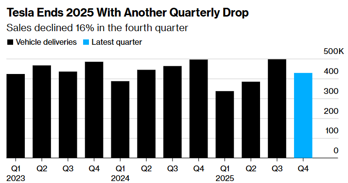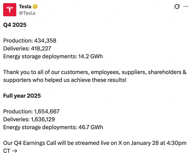 特斯拉推出购车优惠方案。 根据特斯拉发布的数据,公司2025年四季度生产超过43.4万辆,同比下降5.5%;交付了超过41.8万辆,同 比下降约16%。 而根据StreetAccount汇总的估算,华尔街分析师预计特斯拉2025年四季度交付量为42.6万辆。 分析认为,特斯拉2025年四季度销量下降主要受到美国联邦政府提前在9月30日前终止电动汽车激励措 施的影响。这一决定比原计划更早,并促使特斯拉及其他汽车制造商的电动汽车销量提前至第三季度。 此外,特斯拉的储能业务则维持高速增长。公司2025年第四季度部署了14.2 GWh的电池储能产品,相 比2024年的12.5 GWh大幅增长13.6%。特斯拉的电池储能系统包括家庭备用电池以及与数据中心和公用 事业配套使用的大型系统。 特斯拉将于2026年1月28日(星期三)市场收盘后公布2025年第四季度的财务业绩。届时,特斯拉将发布 一份简短的公告,其中包含2025年第四季度更新的数据。 1月6日,据特斯拉公众号消息,特斯拉Model 3/Y/Y L推出7年超低息购车方案。其中,Model 3/Y首付 7.99万元起,月供可低至1918元;Model Y L首付9 ...