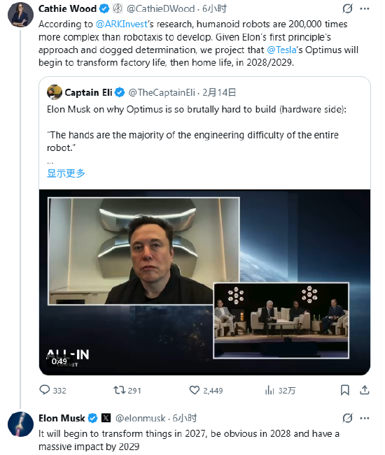 方舟投资管理公司创始人凯茜·伍德在X上发帖称:"根据ARKInvest的研究,开发人形机器人要比开发机 器人出租车复杂20万倍。鉴于埃隆·马斯克秉持的第一原则和坚定决心,我们预测特斯拉的擎天柱机器 人将在2028/2029年开始改变工厂生活,进而改变家庭生活。" 马斯克回应称:"它将在2027年开始改变现状,到2028年影响将显而易见,到2029年将产生巨大的影 响。" 责任编辑:于健 SF069 方舟投资管理公司创始人凯茜·伍德在X上发帖称:"根据ARKInvest的研究,开发人形机器人要比开发机 器人出租车复杂20万倍。鉴于埃隆·马斯克秉持的第一原则和坚定决心,我们预测特斯拉的擎天柱机器 人将在2028/2029年开始改变工厂生活,进而改变家庭生活。" 马斯克回应称:"它将在2027年开始改变现状,到2028年影响将显而易见,到2029年将产生巨大的影 响。" 责任编辑:于健 SF069 ...