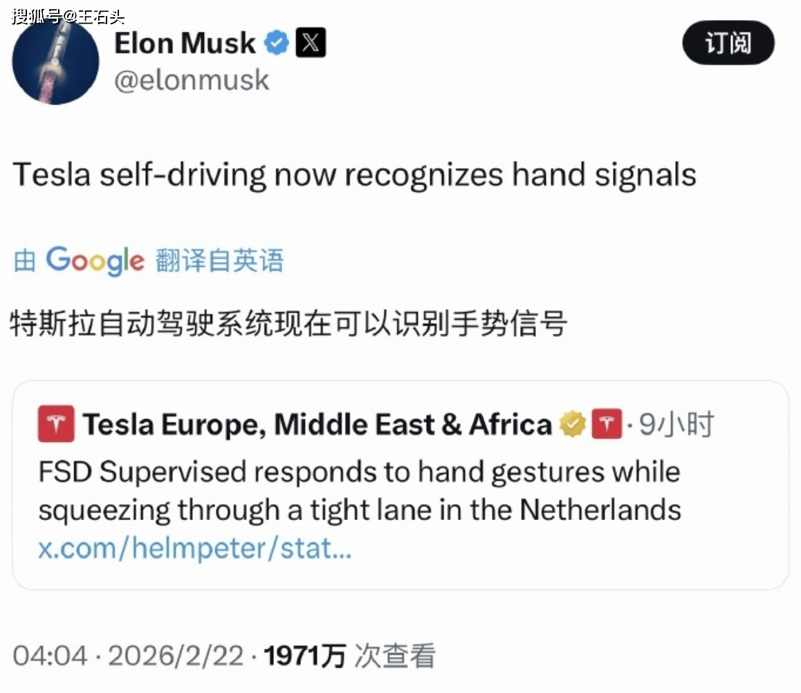 据 Teslaoracle 报道,最新 FSD v14.2 子版本官方发布说明显示,特斯拉对神经网络进行了进一步优化,其 AI 系统现在能更精准地识别人类手势。 IT之家 2 月 22 日消息,今日特斯拉官方社交媒体账号 @teslaeurope 发布最新测试视频,展示其 FSD Supervised 系统在欧洲道路环境下的技术进展。 IT之家注意到,视频内容显示,测试车辆在荷兰境内狭窄车道行驶过程中,系统能够实时捕捉并解析前方人员的手势指令,据此执行前进或停车等操作,展 现出接近人类驾驶员的判断能力。 特斯拉首席执行官埃隆 · 马斯克随后通过个人社交账号转发该视频,并确认:"特斯拉自动驾驶系统现在可以识别手势信号。" 本次升级优化了神经网络视觉编码器,利用更高分辨率的特征信息,进一步提升了对紧急车辆、道路障碍物及人类手势等场景的处理能力。 一位特斯拉车主对 FSD v14.2.1 进行了场景测试:在红灯路口,交警正用手势指挥交通。尽管信号灯为红灯,但交警示意车辆前行。FSD v14.2.1 遵从手势指 令直接行驶,无视红灯限制。坐在驾驶位的安全员已准备踩下加速踏板,但车辆完全自主驶过红灯,无需人工干预。在该 ...
