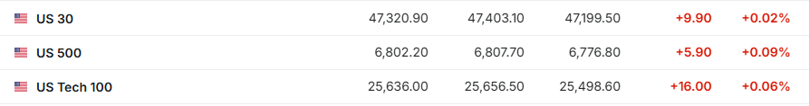 盘前市场动向 1.11月6日(周四)美股盘前,美股三大股指期货齐涨。截至发稿,道指期货涨0.02%,标普500指数期货涨0.09%,纳指期货涨 0.06%。 | = US 30 | 47,320.90 | 47.403.10 | 47,199.50 | +9.90 | +0.02% | | --- | --- | --- | --- | --- | --- | | = US 500 | 6,802.20 | 6,807.70 | 6.776.80 | +5.90 | +0.09% | | = US Tech 100 | 25,636.00 | 25,656.50 | 25,498.60 | +16.00 | +0.06% | 2.截至发稿,德国DAX指数跌0.08%,英国富时100指数跌0.37%,法国CAC40指数跌0.44%,欧洲斯托克50指数跌0.04%。 | 德国DAX30 | 24,030.79 | 24,061.79 | 23,931.02 | -18.08 | -0.08% | | --- | --- | --- | --- | --- | --- | | 瑞 英国富时100 | 9.741.3 ...