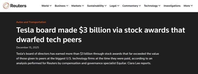 来源:环球网 【环球网科技综合报道】12月16日消息,据路透社报道,薪酬和企业治理研究机构Equilar开展的专项分 析显示,特斯拉董事会成员通过股票奖励累计获利超30亿美元,这一数字大幅超过同期美国其他科技巨 头向其董事授予的股票奖励总额,引发市场广泛关注。 据悉,特斯拉董事收益丰厚的重要原因之一,是其最初获得的股票随着公司股价后续飙升而大幅增值。 包括英伟达、Alphabet、Meta、苹果、微软、亚马逊在内的其他"科技七巨头",虽也受益于股价上涨推 动的牛市行情,但Equilar的分析指出,唯有特斯拉的股票奖励在董事的财富积累中起到了超乎寻常的作 用。 另一个引发关注的点是,特斯拉董事会选择以股票期权而非直接股票的形式支付报酬,这一做法在行业 内较为罕见,并受到部分企业治理专家的批评。股票期权允许持有者在特定时期后以预设价格购买公司 股票,无需承担股价下跌的风险——若股票价值低于预设价格可选择不行权,若股价上涨则能折价购入 后立即抛售获利,这种方式显著放大了收益上涨空间。截至目前,特斯拉董事已行权的期权价值达数千 万美元甚至数亿美元,同时仍持有规模相当的未行权股票期权。 针对相关争议,特斯拉发言人在给路 ...