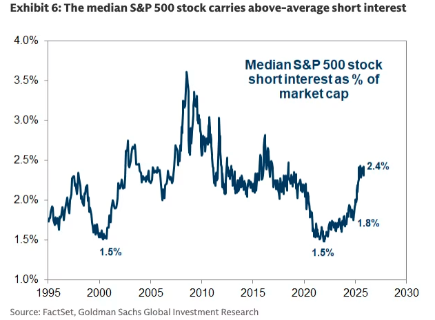 随着近来美股市场出现动荡、甲骨文CDS(信用违约掉期)交易激增,甚至连AI领域的内部人士也开始 承认市场有些泡沫,这使得对冲基金等活跃机构当前是"如何、何时、何地"做空市场,成为了不少投资 者关注的焦点。 好在,高盛最新发布的对冲基金仓位报告,涵盖了不少值得深挖的信息。从高盛报告中能得到的核心发 现是:所谓的"聪明钱"目前尚未准备好大举做空AI巨头,但部分机构却已开始瞄准该领域中实力相对 较弱的的一些公司…… 美股空头仓位处于近年来高位 先来看整体市场的情况。尽管年内经历了强劲的涨势,但标普500指数成分股的空头比例中位数仍然高 得惊人。目前的空头头寸相当于总市值的2.4%,处于过去五年的第99百分位——且远高于自1995年以 来的长期平均水平。 公用事业板块成AI泡沫缩影? 业内人士其实早在今年5月份就注意到美股做空兴趣的回升,但有趣的是,自那时以来,该水平依然略 有上升并保持高位——尽管在7月和10月中旬发生过两次规模虽小但足以令空头感到痛苦的逼空行情。 在不同的指数方面,以科技股为主的纳斯达克100指数目前的空头比例比标普500还要略高,为2.5%。 当然,空头最多盘踞的还是小盘股,罗素2000指数成分 ...