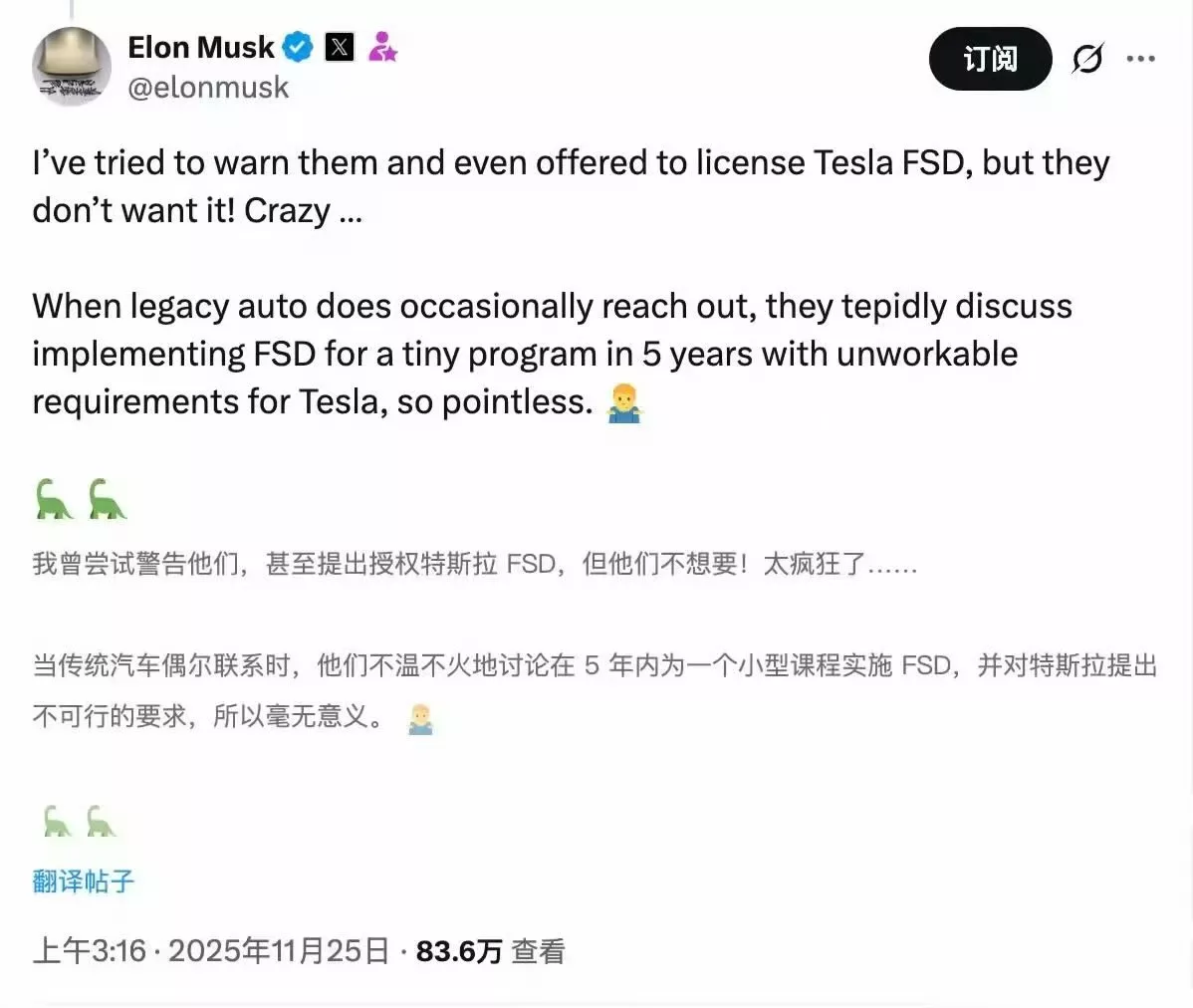 大家好我是大鱼 马斯克用两只 恐龙Emoji 给传统车厂 判了死刑 最讽刺的不是 他们拒绝了FSD 而是他们竟妄想 用五年后的计画 来对接每周 都在进化的AI 这哪里是造车? 根本是在考古! 这其实更是 老马的一记 「免责声明」 当未来Robotaxi 血洗市场 这就是他 仁至义尽的铁证 面对这场 注定的灭顶之灾 传统车厂 还有救吗? 大家不要错过 今天的精彩内容 OK let's go 特斯拉的股票 周一收盘是417.78% 全天上涨了 26.69%美元 涨幅是6.82% 成交量是 9625万股 梅利厄斯研究 Melius Research 的分析师 罗布· 韦特海默Rob Wertheimer 刚刚发布了 一份报告 他没有跟你纠结 下个季度的销量 而是直接抛出了 一个历史性的判断 报告认为 Tesla 的自动驾驶 优势正在接近一个 『不可逆转的临界点』 而这将引发 现代工业史上最大的 价值转移之一 这话说得有多重? 他接着补了一刀 这句话我建议 所有还在看空 Tesla 的人听三遍 他说我们的观点 不是Tesla 处于风险之中 而是除了Tesla 以外的所有人 都在危险之中 Wertheimer说 未来五 ...