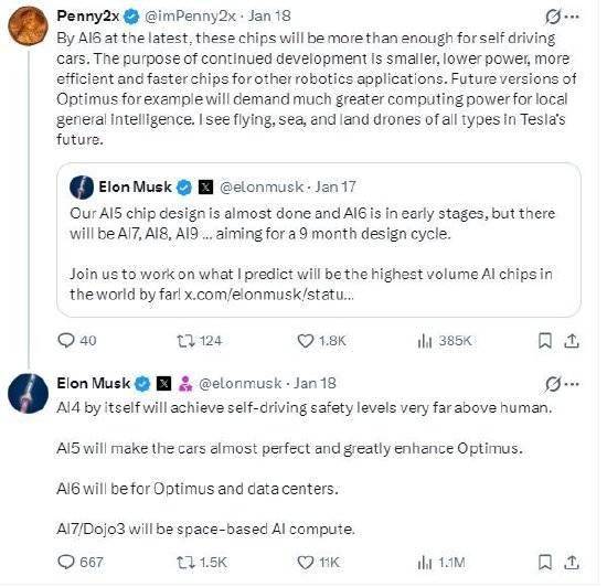 编辑 | 漠影 芯东西1月19日报道,1月17日,马斯克在社交平台上发文,宣布特斯拉AI5芯片设计已接近完成,AI6处于早期阶段,未来还将推出AI7、 AI8、AI9……目标是将设计周期缩短至9个月。他预测这将是迄今全球产量最高的AI芯片。 芯东西(公众号:aichip001) 作者 | ZeR0 根据去年的报道,AI5芯片将采用三星2nm和台积电3nm制程工艺,预计将支持特斯拉的全自动驾驶系统及其他AI驱动的项目,包括Optimus人 形机器人系统。 特斯拉预计AI5的总体性能是AI4的50倍,内存容量是AI4的9倍。 AI5预计在2027年量产。AI6预计将于2028年推出。特斯拉与三星去年签署了一项价值165亿美元(约合人民币1149亿元)的协议,由三星在美 国生产AI6芯片。 ...