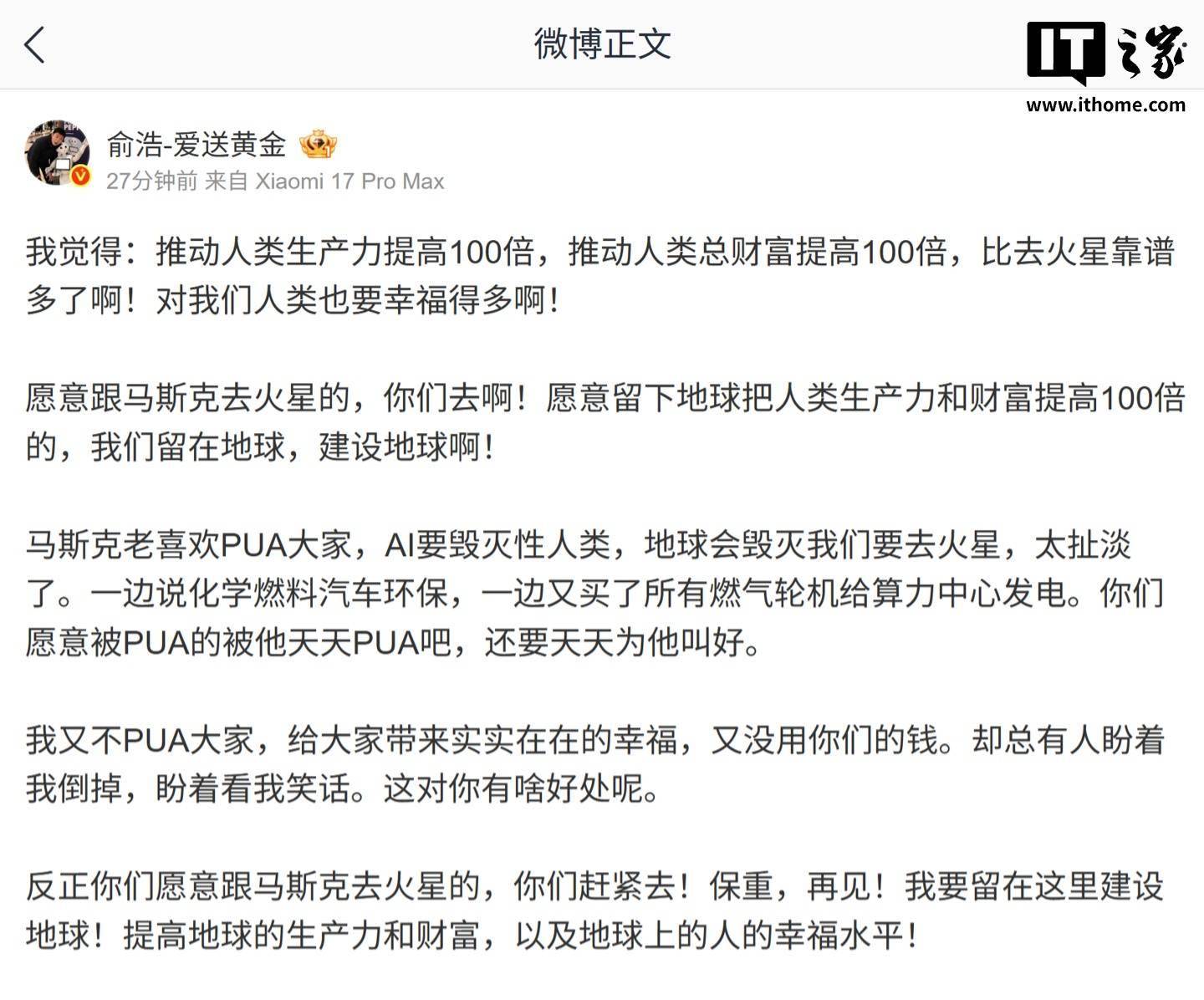 追觅 CEO 俞浩称马斯克总喜欢 PUA 大家,认为推动人类总财富提高 100 倍比去火星靠谱