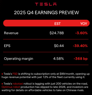 特斯拉(TSLA.US)将于北京时间周四晨间(美东时间周三美股盘后)公布最新季度业绩。该公司持续引发激烈争论, 仍然是市场上最具争议、最受关注的股票之一。投资者对特斯拉的看法几乎没有中间立场。他们要么极度追捧, 要么极度厌恶,一些人预期股价会大幅下跌,而另一些人则期待获得丰厚回报。 由于三季度销售推广和研发项目支出增加,导致运营费用同比飙升50%至34亿美元,营业利润率收缩至5.8%。每股 收益(EPS)同比下降31%至0.50美元,低于市场预期。 该公司储能部门表现尤为突出,装机容量达到创纪录的12.5 GWh,同比增长81%。该部门营收达34亿美元,毛利 润达11亿美元,盈利能力远超汽车部门。 该公司预计, 2026 年的资本支出将从 2025 年的约90亿美元大幅增长,主要用于人工智能基础设施,包括Optimus 机器人项目。尽管支出增加,特斯拉三季度仍创造了约 40 亿美元的创纪录自由现金流,使其现金和投资总额超过 410 亿美元,为其人工智能发展提供了充足的财务灵活性。 第四季度财报电话会议需要关注哪些方面? 第四季度交付数据显示增长势头放缓 疲软的交付量可能对特斯拉的汽车业务收入和利润率造成压力。 ...