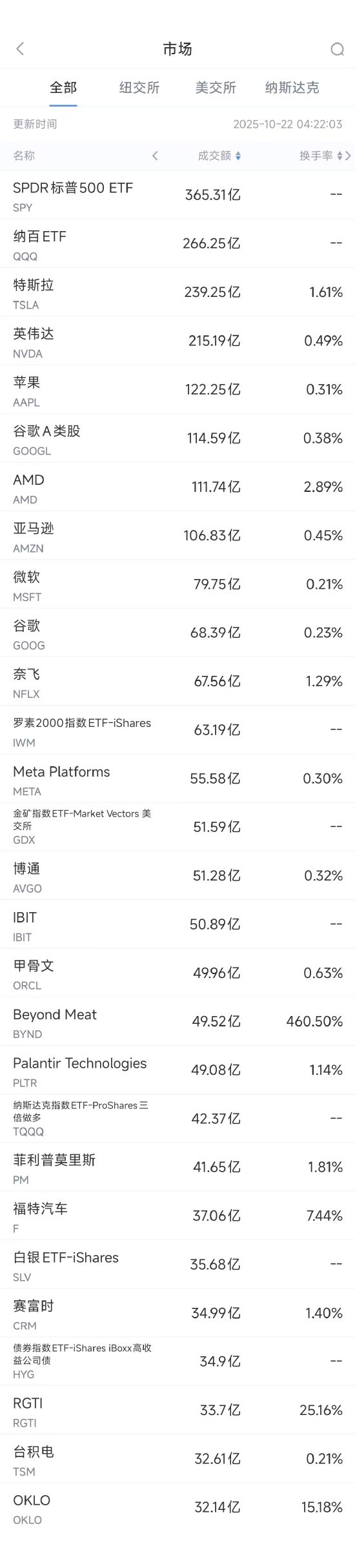 10月22日美股成交额前20:迷因股Beyond Meat三日上涨约600%