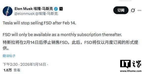 马斯克:特斯拉将在2月14日后停止销售FSD,仅以月度订阅方式提供