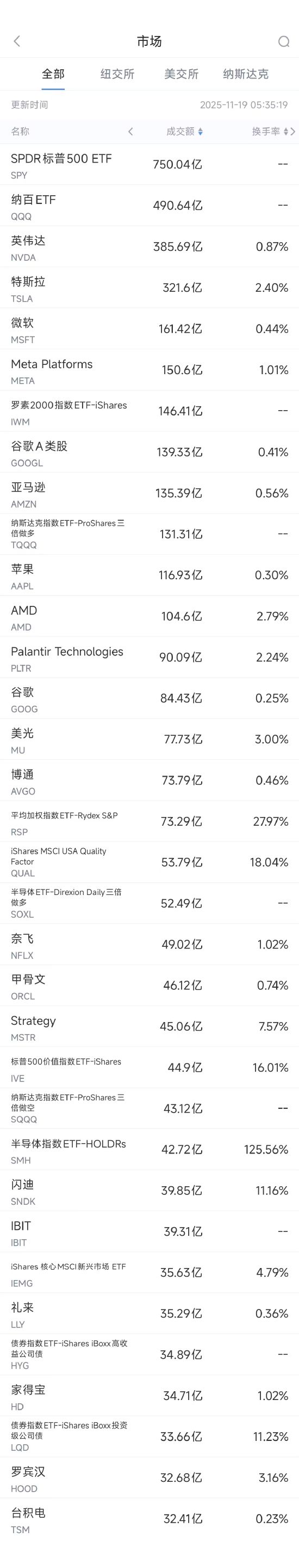 11月19日美股成交额前20:家得宝CEO称业绩不及预期主因未出现极端天气