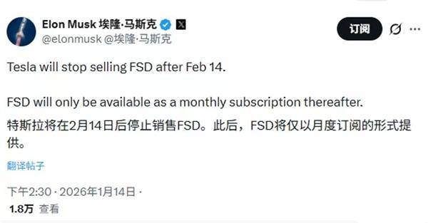 马斯克:特斯拉将在2月14日后停售FSD,此后仅提供月度订阅方式
