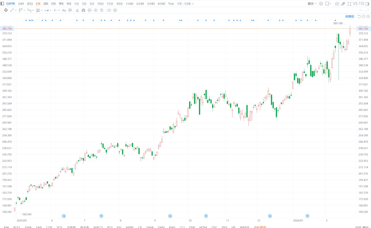 【导读】科技股大涨了 中国基金报记者 泰勒 大家好啊,最近的美股市场,波动也太大了,前一个交易日大跌,今晚又大涨,来回反复横跳,一起看 看发生了什么事情。 科技股集体暴涨 2月24日晚间,美股三大指数大涨,道指涨约400点,纳斯达克指数涨近1%,标普指数涨约0.6%。 华尔街在人工智能(AI)颠覆性影响引发各行业普跌的一天后,出现了初步的反弹。 AMD领涨市场,股价暴涨7%。消息面上,Meta宣布与AMD达成多年协议 。这一新伙伴关系涉及为人 工智能数据中心部署高达600万千瓦的AMD图形处理器(GPU)。Meta还将通过基于业绩的认股权证向 AMD投资,可获得多达1.6亿股AMD股票。 此外,台积电股价大涨超4%,市值首度突破2万亿美元。 | 了 筛选 | 最新价 = | 涨跌幅 = □* | | --- | --- | --- | | 美国超威公司 | 211.23 | +7.44% | | US AMD. | | | | 英特尔 | 45.90 | +5.20% | | US INTC | | | | 台积电 | 387.20 | +4.64% | | US TSM | | | | 赛富时 | 186. ...