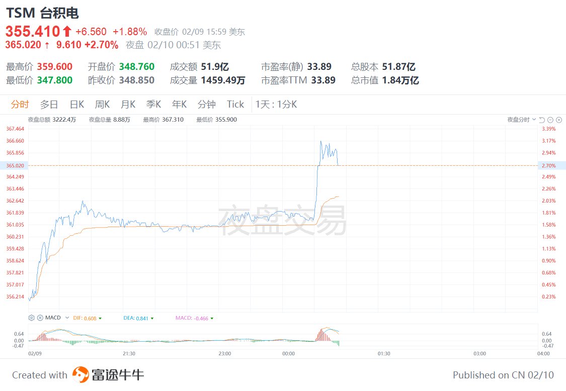 | 最高价 359.600 开盘价 348.760 成交额 51.9亿 市盈率(静) 33.89 总股本 51.87亿 | | --- | | 最低价 347.800 昨收价 348.850 成交量 1459.49万 市盈率TTM 33.89 总市值 1.84万亿 | 台积电(TSM.US)在目前的夜盘交易中直线拉升,一度涨超3%报366.66美元。消息面上,台积电刚刚公布,1月销售额4012.6亿元台币,首次突破4000亿关 卡,同比增长36.8%,较2025年12月增长19.8%。 ...