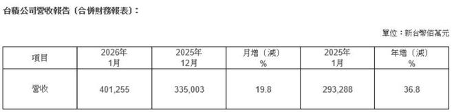 | 項目 | 2026年 | 2025年 | 月増(減) | 2025年 | 年增(減) | | --- | --- | --- | --- | --- | --- | | | 1月 | 12月 | 96 | 1月 | % | | 营收 | 401,255 | 335,003 | 19.8 | 293,288 | 36.8 | 格隆汇2月10日|台积电1月销售额4012.6亿元台币,同比增长36.8%,较2025年12月增长19.8%。 来源:格隆汇APP ...