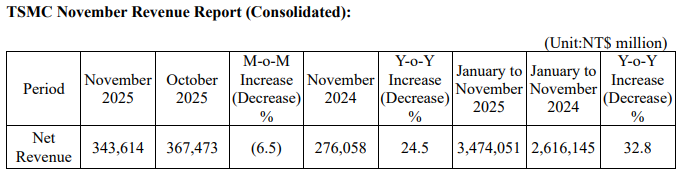 台积电:11月营收3436.14亿元新台币 同比增加24.5%