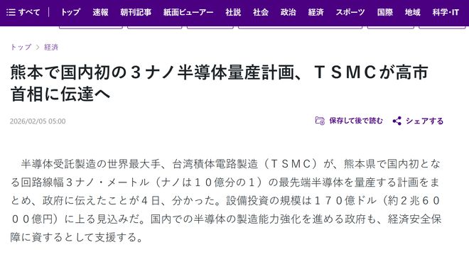 来源:环球网 【环球网科技综合报道】2月5日消息,据日本《读卖新闻》消息,台积电计划于今日正式向日本政府提 交通知,对其在日控股子公司JASM的第二晶圆厂规划进行重大调整,将原定主要生产的6nm逻辑半导 体工艺升级为3nm,项目总投资额也将从原定的122亿美元提升至170亿美元。 据悉,此次制程工艺升级是台积电优化海外产能布局的重要举措,3nm工艺作为当前先进半导体制造技 术的代表,其量产落地将进一步提升全球高端芯片供应能力。 对于此次调整,日本政府方面已明确表态,认为JASM第二晶圆厂转产3nm工艺后,不会与该国企业 Rapidus正在推进的2nm项目形成市场竞争,双方将在不同技术节点形成互补发展格局。(纯钧) ...