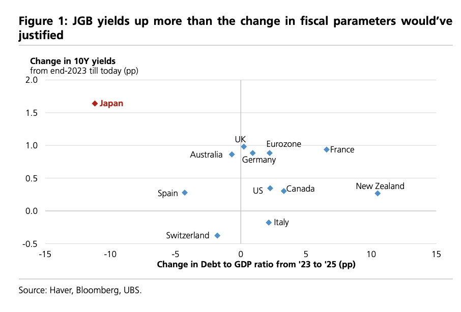 瑞银(UBS)最新全球策略报告指出,近期日本国债(JGB)收益率的急剧攀升已显著超出财政基本面可解释的范围,核心驱动来自 市场对通胀预期的重新定价。该行认为,当前通胀将在年中回落至1.5%左右,这将成为日债与日元走势的关键转折点。 据追风交易台,报告指出,对于投资者而言,这传递出三个关键信号:首先,此次波动并非类似英国2022年"特拉斯危机"的系统性 风险事件,日本股市表现仍具韧性,尤其应避免恐慌性抛售利率敏感板块;其次,伴随日债收益率吸引力提升,预计4月新财年启动 后,日本国内资金或将从海外债市大规模回流,重新配置日本国债;最后,通胀回落将推动实际利率上升,进而为日元提供支撑, 相较于名义利差,实际利率对汇率的影响更为显著。 财政基本面并非罪魁祸首,收益率涨幅已"过度" 尽管市场对日本财政状况存在忧虑,但近期数据显示,日本国债收益率的剧烈波动与实际财政基本面存在明显脱节。 从财政健康度来看,日本情况好于多数发达经济体。自2023年以来,其公共债务占GDP比例已下降11个百分点,而同期发达经济体 整体则上升2个百分点。预计到2026年,日本财政赤字占GDP比重仅为2%左右,显著低于发达经济体4.9%的平均水平 ...