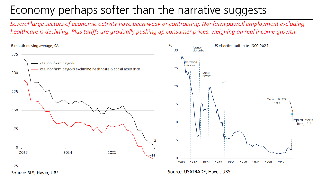 对投资者而言,这意味着市场的定价逻辑存在偏差。美联储(FOMC)正处于两难境地:一方面是疲软的劳动力市场,另一方面是关税带来的成 本推动型通胀。当前的资产价格建立在AI投资持续繁荣和富裕阶层消费强劲的"双支柱"之上。瑞银警告,主要风险在于AI投资热潮的任何动摇都 可能引发衰退(概率为50%)。瑞银认为市场低估了美联储在6月前不得不降息以应对就业恶化的紧迫性。 瑞银认为,美国经济的"韧性"表面之下,实际上是由单一驱动力——人工智能——苦苦支撑的脆弱平衡。 据追风交易台,瑞银在1月23日的报告中指出,尽管总体经济数据看似强劲,但增长来源极其狭窄。除AI和科技板块外,大部分实体经济处于疲 软甚至收缩状态。劳动力市场的扩张已经显著放缓,除去医疗保健行业的"繁荣",就业实际上是在萎缩。 美联储正处于"维持独立性"与"挽救劳动力市场"的夹缝中。 利率路径预测:瑞银预计美联储将在2026年进行两次25个基点的降息,年底联邦基金利率目标区间将降至3.00%至3.25%。 被低估的3月降息:市场目前仅定价了约16%的3月降息概率(即25个基点中的4个基点)。瑞银认为,考虑到2月劳动力报告可能显现 疲软,且通胀反弹可能不及预期, ...