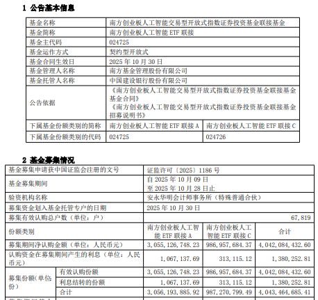 募集期间净认购金额4,042,084,432.60元,认购资金在募集期间产生的利息1,380,252.81元,募集份额合 计4,043,464,685.41份。 基金经理潘水洋曾就职于深圳迈瑞生物医疗电子股份有限公司,任系统研究员。2017年7月加入南方基 金,历任数量化投资部量化研究员、宏观策略部策略研究员、指数投资部研究员,2024年起任基金经 理。 中国经济网北京10月31日讯今日,南方基金发布南方创业板人工智能交易型开放式指数证券投资基金联 接基金基金合同生效公告。 | 基金募集申请获中国证监会注册的文号 | | 证监许可〔2025〕1186号 | | | | --- | --- | --- | --- | --- | | 基金募集期间 | | 自 2025 年 10月 09 日 | | | | | | 至 2025年10月28日止 | | | | 验资机构名称 | | 安永华明会计师事务所(特殊普通合伙) | | | | 募集资金划入基金托管专户的日期 | | 2025 年 10月 30 日 | | | | 募集有效认购息户数(单位:户) | | | | 67.819 | | 份额类别 | | 南方 ...