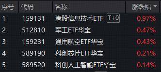 商业航天反复活跃,军工ETF(512810)、通用航空ETF(159231)场内价格分别上涨0.47%和0.43%。消息面上,2月11日,我国长征十号运载火箭一级箭 体完成受控海上溅落,突破可复用火箭关键技术。专家指出,新型"网系回收"方案比传统着陆腿更稳定,有望提升运载效率。 | 序号 代码 | | 名称 | 版大幅 ▼ | | --- | --- | --- | --- | | 15 | 159131 | 港股信息技术ETF T+0 | 0.97% | | 2 | 512810 | 室 ETF半宝 | 0.47% | | 3 | 159231 | 通用航空ETF华宝 | 0.43% | | 4 | 589190 | 科创芯片ETF华宝 | 0.21% | | ഗ | 589520 | 科创人工智能ETF华宝 | 0.14% | 中原证券认为,受益于政策催化提速、资金面边际改善,叠加前期市场调整已释放部分风险,多重因素共同支撑节后市场乐观预期。建议投资者采取均衡配 置策略,在坚守AI等科技成长主线的同时,积极关注具备潜在投资价值的消费板块。预计上证指数大概率维持小幅震荡上行走势,投资者需重点跟踪宏观 经济数 ...