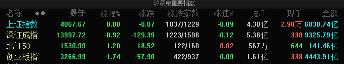 盘面上热点快速轮动,全市场超2900只个股下跌。从板块来看,太空光伏概念爆发,中来股份20cm涨 停,国晟科技2连板。煤炭概念集体反弹,兖矿能源、中煤能源、陕西黑猫涨停。机场航运概念走强, 中国东航、华夏航空涨停。房地产板块表现活跃,荣安地产、财信发展涨停。氢能源概念快速拉升,京 城股份、致远新能涨停。 凤凰网财经讯 2月4日,市场早盘震荡回落,沪指翻绿,创业板指盘中跌超2%。截至午间收盘,沪指几 乎平收,深成指跌0.92%,创业板指跌1.74%。沪深两市半日成交额1.62万亿,较上个交易日放量116 亿。 | | | | | 户深京重要指数 | | | | --- | --- | --- | --- | --- | --- | --- | | 名称 *● | 咸新 | 张幅% | | 涨跌 涨跌家数 | The Research and Career of the Career of Children | 现手 金额 | | 上证指数 | 4067.67 | 0.00 | -0.07 | 1037/1229 | -0.09 4.30亿 | 2.98万 6830.74亿 | | 深证成指 | 13997.72 ...