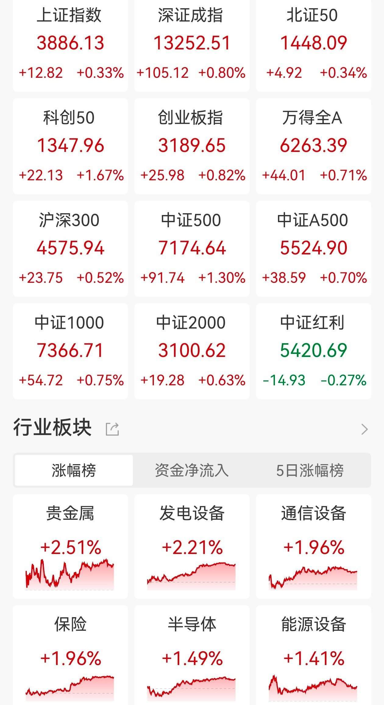 盘面上,可控核聚变、核能核电板块掀涨停潮,雪人集团、安泰科技及东方电气(600875)等十余股涨 停;超导概念走高,西部材料(002149)涨停;国际金银价格齐涨,贵金属板块走强,招金黄金涨近8%; 商业航天板块反复活跃,超捷股份等多股涨停;电源设备、海工装备、CPO概念及半导体等板块涨幅居 前。另外,商业百货板块下挫,茂业商业(600828)跌停;免税概念走低,中百集团(000759)跌逾6%;房 地产服务板块走弱,南都物业(603506)跌停;SPD概念、铁路公路、微盘股及氟化工等板块跌幅居前。 (格隆汇) 格隆汇12月12日|A股三大指数今日震荡上行,截至收盘,沪指涨0.41%报3889点,深证成指涨0.84%, 创业板指涨0.97%。全市场成交额2.12万亿元,较前一交易日增量2338亿元,近2700股上涨。 | 上证指数 深证成指 | 北证50 | | --- | --- | | 3886.13 13252.51 1448.09 | | | +12.82 +0.33% +105.12 +0.80% +4.92 +0.34% | | | 科创50 创业板指 | 万得全A | | 1347.96 318 ...