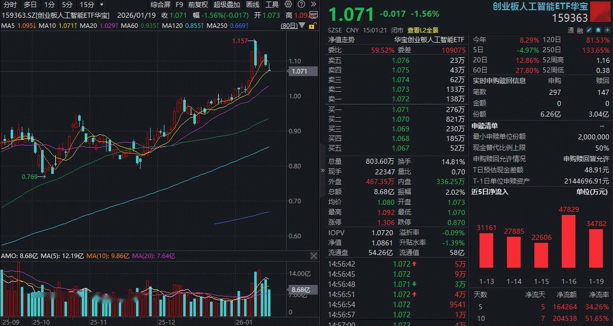 Market Overview - The ChiNext AI sector experienced fluctuations and corrections, with funds continuing to buy on dips. Most constituent stocks declined, with notable gainers including Hangyu Micro up over 6% and BlueFocus up over 3%. Conversely, Ruijie Networks led the decline, falling over 10% [1][8]. - The ChiNext AI ETF (159363) saw a slight decline of 1.56%, retreating to the 10-day moving average, with a trading volume of 868 million yuan. After a significant inflow of nearly 1.7 billion yuan in the previous week, the fund recorded a net inflow of 347 million yuan over six consecutive days, totaling over 2 billion yuan [1][8]. Fund Performance - The ChiNext AI ETF managed by Huabao reached a new high in scale, totaling 6.164 billion yuan as of January 19, with an average daily trading volume of nearly 800 million yuan over the past six months, leading among the eight ETFs tracking the ChiNext AI index [4][12]. - The fund manager indicated that short-term corrections do not alter the strong performance expectations for the A-share market in the first half of the year, suggesting that performance stocks in the optical module sector may become a focal point for market consolidation during this period [5][10]. Sector Insights - From a funding allocation perspective, the optical module sector is expected to attract attention due to positive earnings forecasts. The market is anticipated to undergo structural adjustments as companies begin to disclose their annual reports, with performance becoming a key driver of market dynamics [3][10]. - The AI application sector has emerged as a leading theme for 2026, with a year-to-date increase of 19%, making it the top performer in the A-share market. The ongoing trend of AI applications accelerating towards commercialization is expected to continue, supported by China's advantages in application deployment and user scale [11][13]. Investment Strategy - The ChiNext AI ETF is strategically positioned with approximately 60% of its portfolio in computing power (primarily optical modules) and about 40% in AI applications, reflecting a balanced approach to both sectors [13].