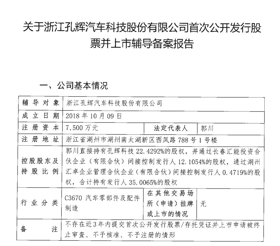汽车Tier 1龙头,正式开启上市征程。 近日,国产空气悬挂公司浙江孔辉汽车科技股份有限公司(以下简称"孔辉科技")在浙江证监局完成IPO辅导备案登记,辅导机构为中信建投。这家由中 国工程院院士郭孔辉父子及学生组成核心团队的创业公司,冲刺资本市场。 | 导对象 辅 | 浙江孔辉汽车科技股份有限公司 | | --- | --- | | 成立日期 | 2018年10月09日 | | 注册资本 | 7,500 万元 法定代表人 郭川 | | 注册地址 | 浙江省湖州市湖州南大湖新区西凤路 788号 1 号楼 | | 控股股东及 | 郭川直接持有孔辉科技 22.4292%的股权,并通过长春汇能投资合 | | 持 股 比 例 | 伙企业(有限合伙)间接控制发行人 12. 1054%的股权,通过湖州 汇卓企业管理合伙企业(有限合伙)间接控制发行人 0.4719%的股 | | | 权,合计持有发行人35.0065%的股权 | | 行业分类 | 在其他交易场 C3670 汽车零部件及配件 所(申请)挂牌 | | | 元 制造 | | | 或上市的情况 | | 注 | 不存在近3年内提交首次公开发行股票/存托凭证并上市申请被终 ...