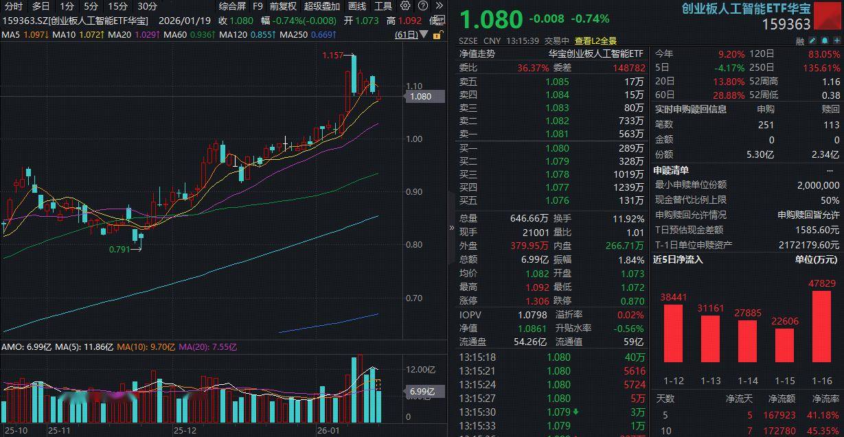 展望后市,当前AI发展从算力建设走向应用落地,一键布局"算力+AI应用"的创业板人工智能ETF(159363)及场外联接(A类023407、C类023408),更直 接受益于AI技术商业化爆发的增长红利。从赛道看,创业板人工智能约六成仓位布局算力(光模块为主),约四成仓位布局AI应用,不止是"算力"核心, 也是真正的"AI应用"代表。 1月19日,创业板人工智能震荡下探1%,大额资金继续涌入。成份股跌多涨少,截至发稿,航宇微、蓝色光标领涨超5%,铜牛信息、首都在线、新易盛等 上涨超2%。下跌方面,锐捷网络领跌超10%,深信服、联特科技、太辰光、光环新网等多股跌超2%。 热门ETF方面,双线布局"算力+AI应用"的创业板人工智能ETF(159363)场内下探1%,盘中下触10日线,资金逢跌买入。继单周爆买近17亿元后,今日盘 中资金再度净申购3亿份,按场内平均价估算约超3亿元。 | 分时 多日 1分 5分 15分 30分 综合屏 F9 前复权 超级叠加 画线 工具 ♡ 2 » | | | | | | 创业板人工智 | | --- | --- | --- | --- | --- | --- | --- | | 2 ...