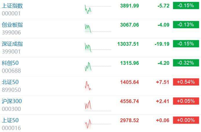 Core Points - A-shares experienced a decline with all three major indices turning negative during the trading session, despite the ChiNext Index initially rising over 1% [1] - Nearly 4,000 stocks in the Shanghai, Shenzhen, and Beijing markets saw declines [1] Index Performance - Shanghai Composite Index: 3891.99, down 5.72 points, a decrease of 0.15% [2] - ChiNext Index: 3067.06, down 4.09 points, a decrease of 0.13% [2] - Shenzhen Component Index: 13037.51, down 19.19 points, a decrease of 0.15% [2] - STAR Market 50 Index: 1315.96, down 4.20 points, a decrease of 0.32% [2] - North Exchange 50 Index: 1405.64, up 7.51 points, an increase of 0.54% [2] - CSI 300 Index: 4556.74, up 2.41 points, an increase of 0.05% [2] - Shanghai 50 Index: 2978.52, up 0.06 points, a negligible change [2]