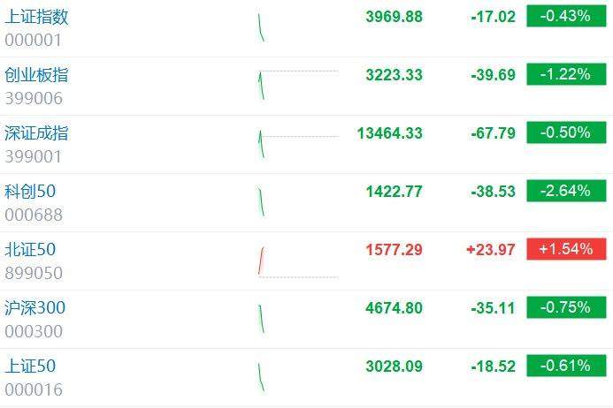 09:25 A股开盘丨三大指数集体低开 沪指跌0.05%,深证成指跌0.11%,创业板指跌0.08%。 | 代码 | 名称 | 两日图 | 现价 | 涨跌 | 涨跌幅 | | --- | --- | --- | --- | --- | --- | | 000001 | 上证指数 | 7 | 3985.06c | -1.84 | -0.05% | | 399001 | 深证成指 | wh | 13517.17c | -14.95 | -0.11% | | 399006 | 创业板指 | WN | 3260.26c | -2.76 | -0.08% | 盘面上,存储芯片、培育钻石、光伏、新能源车题材走弱;免税店、锂电池、黄金概念股走强。 09:46 富时中国A50指数期货跌幅扩大至1%。 09:43 创业板指跌幅扩大至1%,上证指数跌0.42%,深证成指跌0.46%,存储芯片、F5G概念、光通信模块等板块跌幅居前,两市下跌个 股超1700只。 09:38 恒生科技指数跌超1%,比亚迪股份跌超5%领跌成分股。 09:35 免税店板块盘初拉升,海汽集团触及涨停,凯撒旅业、海南发展、中国中免、东百集团跟涨。 09:27 ...