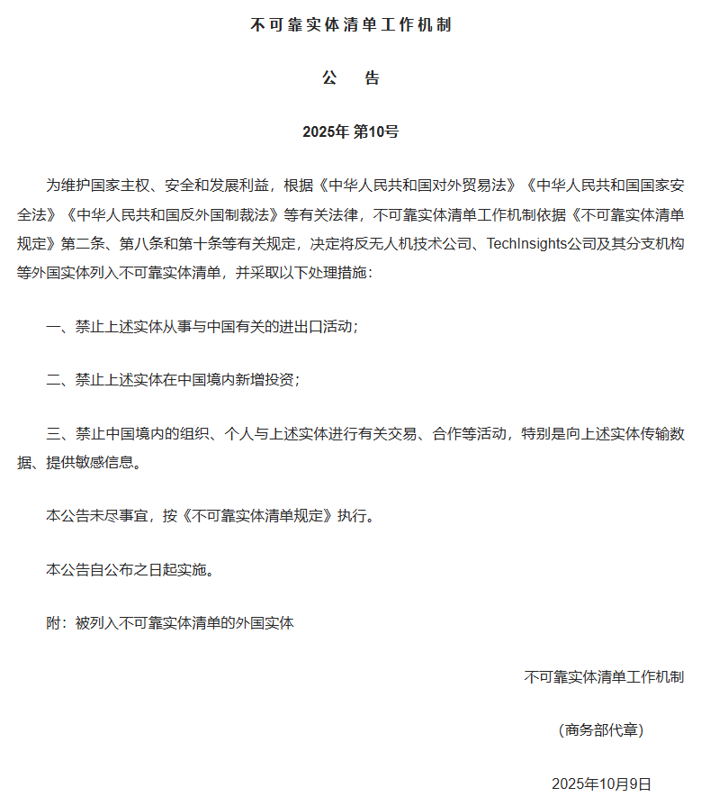 不 可 靠 实 体 清 单 工 作 机 制 公 告 附:被列入不可靠实体清单的外国实体 不可靠实体清单工作机制 (商务部代章) 2025年10月9日 2025年 第10号 为维护国家主权、安全和发展利益,根据《中华人民共和国对外贸易法》《中华人民共和国国家安 全法》《中华人民共和国反外国制裁法》等有关法律,不可靠实体清单工作机制依据《不可靠实体清单 规定》第二条、第八条和第十条等有关规定,决定将反无人机技术公司、TechInsights公司及其分支机 构等外国实体列入不可靠实体清单,并采取以下处理措施: 一、禁止上述实体从事与中国有关的进出口活动; 二、禁止上述实体在中国境内新增投资; 三、禁止中国境内的组织、个人与上述实体进行有关交易、合作等活动,特别是向上述实体传输数 据、提供敏感信息。 本公告未尽事宜,按《不可靠实体清单规定》执行。 本公告自公布之日起实施。 附 被列入不可靠实体清单的外国实体 6. Exelis公司(Exelis Inc.) 7. 联合技术系统运营公司(Alliant Techsystems Operations LLC) 1. 反无人机技术公司(Dedrone by Axon) 2. ...
