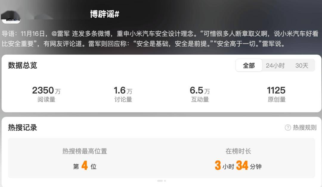 今天(11月16日) 雷军连发多条微博 重申小米汽车安全设计理念 相关话题冲上了热搜 雷军表示 ⬇️ 在去年4月的一次采访中,我在谈产品定义时说,"一辆车,好看是第一位的",这和"安全是基础、安全 是前提"矛盾吗?还是在这次采访,我谈设计时候说轮毂最难设计,这有啥问题? 他在微博附上自己于2023年和2024年发布的四则微博截图,称"这是小米SU7发布之前我发的微博,我 谈对安全的理解和SU7的研发标准。" 雷军在这四则微博中 多次强调"安全高于一切" ⬇️ 小米SU7按最严苛的三大标准设计:以2024版C-NCAP五星、2023版Euro NCAP五星及C-IASI 3G+为设 计底线,覆盖被动安全、主动安全、电池安全与隐私安全四重保护。 在车身结构上,SU7采用MI铠甲笼式钢铝混合车身,高强度钢和铝合金占比达90.1%,最高强度达 2000MPa,整车扭转刚度达51,000N·m/deg。 电池安全方面,小米自研并自建电池包工厂,采用14层硬核物理防护、17层高压绝缘、双大面主动冷却 (7.8㎡水冷面积)及165片气凝胶隔热材料,行业首创电芯倒置技术,确保热失控时喷射方向远离乘员 舱,实现"无明火、无热蔓 ...