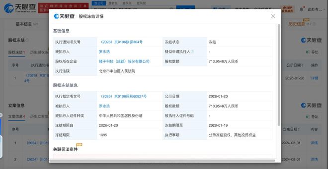 天眼查天眼风险信息显示,近日,罗永浩新增一则股权冻结信息,股权所在企业为锤子科技 (成都)股份有限公司,冻结股权数额713万余元,冻结期限自2026年1月20日至2029年1月 19日,执行法院为北京市丰台区人民法院。 | 基本信息 m | C天眼直 股权冻结详情 | 第二次 2012 | | | × 历史信息 117 | School | | --- | --- | --- | --- | --- | --- | --- | | | 基础信息 | | | | | | | 股权冻结 | 执行通知书文号 | (2026) 京0106执保304号 | 冻结状态 | 冻结 | | ●天眼色 | | 股权冻墙1 防史版社 | 被执行人 | 同永浩 | 疑似申请执行人 | . | | 0 导出 | | | 股权所在企业 | 顿子科技(成都) 股份有限公司 | 服按數額 | 713.9548万人民币 | | | | 用号 抗行通知 | 执行法院 | 北京市丰台区人民法院 | | | 公示日期: | 临作 | | (2026) RO | | | | | 2026-01-20 | 四川 | | 45 | 股权冻结信息 | | ...