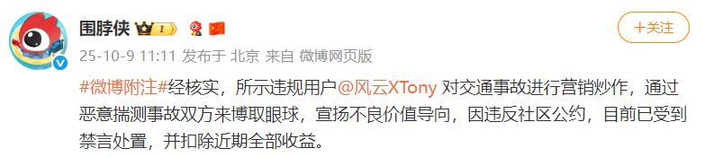 10月9日,据@围脖侠 :经核实,用户@风云XTony 对交通事故进行营销炒作,通过恶意揣测事故双方来博取眼球,宣扬不良价值 导向,因违反社区公约,目前已受到禁言处置,并扣除近期全部收益。 此前,该博主发文称 :"早说了,被陈震撞,是一种幸运。陈震车祸受害人账号注销了,明显就是陈震钱给到位了嘛,大几百万是 有的,一辈子挣的钱都到手了。 那些说敲诈勒索的出来走走?我再说一遍,交通事故受害者,有人受伤的情况下,受害者可以多要钱,想要多少都可以,张嘴一 个亿都行。合理不合理另说,但完全合法,不存在敲诈勒索。当然给不给取决于你,你可以不给。但陈震,一定不会不给。因为 他需要名声,他的名声是钱。" 此前报道: 10月4日,北京交警发布情况通报: 10月3日15时许,在海淀区朱各庄路与万寿路交叉口,陈某(男,43岁)驾驶小客车由北向南行驶时,与对向一辆小客车发生事 故,造成两车损坏。双方驾驶人不涉毒、不涉酒。经初步调查,陈某负事故全部责任。目前,事故正在进一步处理中。 同日,陈震就"劳斯莱斯车祸"一事发文致歉: "我都看到了,是我的问题,一切负面照单全收,全力配合解决问题中,不会有丝毫懈怠,事故经过以官方公告、车辆EDR ...