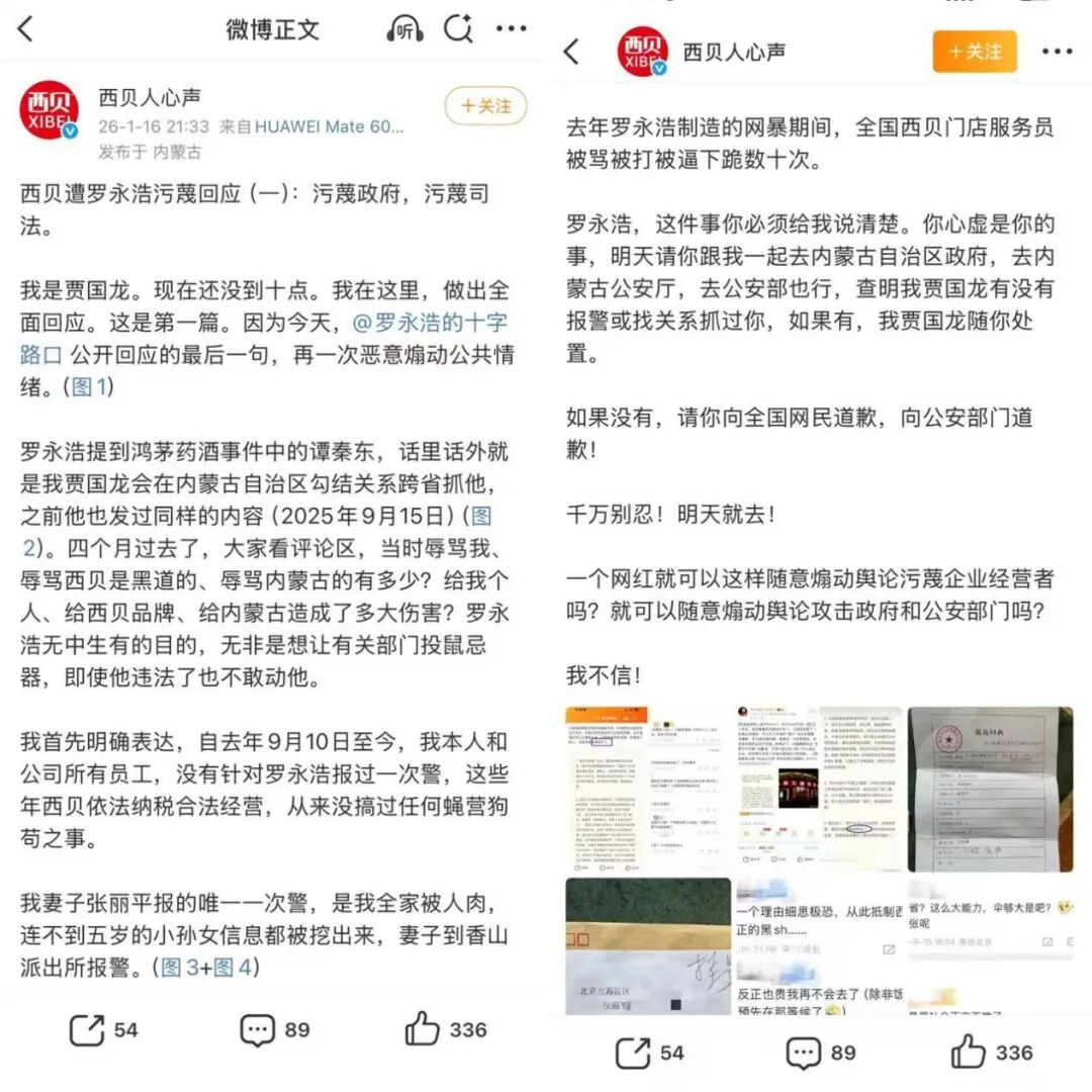 Core Viewpoint - The ongoing public dispute between Luo Yonghao and Jia Guolong has escalated, with both parties facing significant backlash and consequences on social media platforms, particularly regarding the reputation of the Xibei brand and its operational challenges [1][6]. Group 1: Incident Overview - Jia Guolong, founder of Xibei, responded to accusations from Luo Yonghao through an official Weibo post rather than a live video, accusing Luo of maliciously inciting public sentiment [1]. - Luo's comments have led to severe online harassment against Xibei staff, with reports of dozens of incidents involving verbal abuse and physical threats [3]. - Xibei's financial situation has deteriorated, with projected losses exceeding 600 million yuan from September 2025 to March 2026, prompting the closure of over a hundred stores [6]. Group 2: Responses and Reactions - Jia Guolong issued two demands to Luo Yonghao: to jointly verify police reports regarding alleged threats and to publicly apologize if no evidence is found [3]. - The public's focus appears to be shifting away from the dispute itself to concerns about the quality and taste of Xibei's food offerings [3]. - Both Luo Yonghao and Jia Guolong's Weibo accounts have been suspended, indicating a crackdown on online disputes that escalate into public conflicts [2][3].