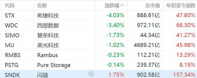 | 代码 | 名称 | | 涨跌幅 ^ | 总市值 | 年初至今涨跌 | | --- | --- | --- | --- | --- | --- | | STX | 希捷科技 | | -4.03% | 888.61亿 | 47.80% | | WDC | 西部数据 | | -3.40% | 972.11亿 | 66.30% | | SIMO | 慧荣科技 | | -1.73% | 44.34亿 | 41.27% | | MU | 美光科技 | | -1.02% | 4689.21亿 | 45.98% | | RMBS | Rambus | | -0.23% | 112.21亿 | 13.29% | | PSTG | Pure Storage | | -0.14% | 239.37亿 | 8.19% | | SNDK | 闪迪 | 0 | 1.75% | 902.58亿 | 157.34% | 格隆汇2月19日|美股市场存储概念股普跌,其中,希捷科技跌4%,西部数据跌超3%,慧荣科技、美 光科技跌超1%,唯闪迪涨近2%。有消息称三星电子正就新一代HBM4芯片展开价格谈判,报价较上代 产品高出最多30%,达到约7 ...