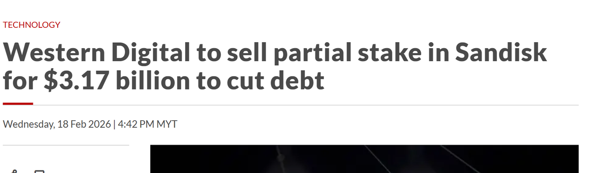 2月18日,硬盘制造商西部数据宣布,计划通过二次配售出售子公司闪迪的部分股权,交易规模约30.9亿美元(合213亿元人民币)。 据闪迪发布的声明,西部数据计划将其持有的闪迪股票与摩根大通证券、美银证券关联方持有的西部数据债务进行置换,置换完成后由承销商在二级市场 出售。此次出售的股份约为580万股,定价区间最终确定为每股545美元,较闪迪周二收盘价折让约7.7%。闪迪本身不参与发行。 此次减持举措在市场的意料之中。此前召开的财报电话会议上,西部数据CFO Kris Sennesael表示,计划在2月24日分拆一周年前出售剩余的750万股闪迪 股份。根据去年向美国证券交易委员会提交的注册文件,西部数据必须在2月21日前完成股份出售以避免税务后果。 Evercore ISI分析师表示,这笔交易实质性加速了西部数据的去杠杆化进程,公司未来可能转向净现金状态。通过股票回购减少流通股数量,这笔交易有 望在短中期内推动西部数据每股收益增长4%至6%。 从市场表现来看,近几个月来,闪迪股价表现抢眼。自2025年2月从西部数据分拆以来,累计涨幅已超过1500%。仅2026年,闪迪股价上涨近150%,在标 普500指数成份股中 ...