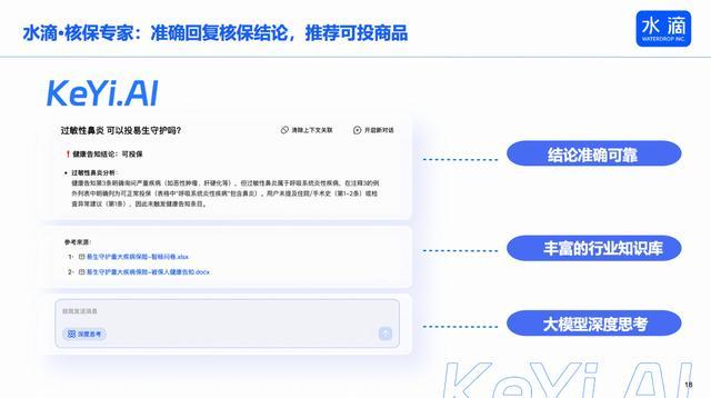 关键词 AI核保、智能服务、健康险数字化、保险科技生态、普惠保障 水滴公司于2025年以AI技术为核心驱动力,推动健康险服务实现从"人工依赖"到"智能决策"的关键转 型。其上线的AI核保专家"KEYI.AI",依托自研"水滴水守大模型"与千万级核保知识库,实现复杂健康 险核保平均处理时间缩短80%、响应速度提升260倍、准确率达99.8%的突破,并将AI能力延伸至客服、 销售辅助、理赔协同等全流程,同时通过开放技术能力赋能行业,联合险企构建普惠生态,为保险行业 智能化转型提供实践样本。 案例正文: 在健康险市场,"投保难、核保慢"长期是用户与行业的双重痛点。调研数据显示,48%的受访者认为保 险产品"过于专业",传统人工核保面对非结构化的医疗记录、健康问卷时,不仅平均处理周期长达数 天,还易因审核人员经验差异产生误判;带病人群、老年人群等"非标体"群体,更常因健康告知门槛陷 入"想买却难买"的困境。2025年,水滴公司通过聚焦核保环节的技术革新,将AI能力贯穿保险服务全链 条,重新定义健康险的效率与覆盖边界。 作为国内较早布局AI大模型应用的保险科技平台,水滴公司以"用互联网科技助推广大人民群众有保可 医,保 ...