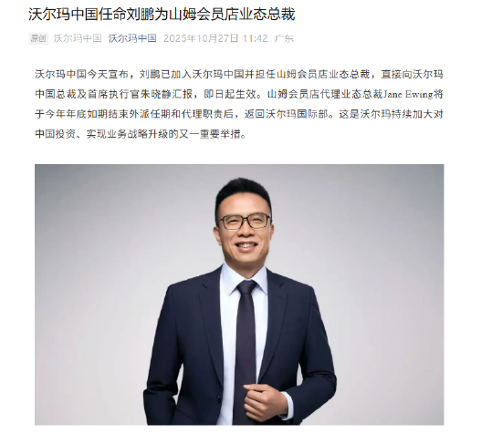 来源:环球网 【环球网科技报道 记者 李文瑶】10月27日,沃尔玛中国正式宣布了一项备受业内关注的人事任命:刘 鹏加入公司,出任山姆会员店业态总裁,直接向沃尔玛中国总裁及首席执行官朱晓静汇报。原代理业态 总裁Jane Ewing将于年底结束外派,返回沃尔玛国际部任职。 业内普遍认为,在零售行业竞争日趋复杂、会员制赛道从"规模扩张"走向"价值深耕"的关键节点,这位 兼具全球视野、中国消费洞察与全渠道数字化基因的"零售老兵"的加入,不仅是一次高层人事调整,也 是沃尔玛中国在组织能力与战略方向上的一次主动升维。 刘鹏是谁? 刘鹏的履历贯穿传统零售与互联网平台。根据公开信息,2015年至2024年,刘鹏任职于阿里巴巴集团, 先后担任天猫国际总经理、天猫进出口业务总裁、阿里巴巴集团副总裁兼 B2C 零售事业群总裁、淘天 集团品牌业务发展中心总裁等职务,是阿里巴巴电商业务的核心管理层。 在加入阿里之前,刘鹏曾就职于好孩子中国、万得城中国、苏宁电器、海尔集团,涉足采购、市场营销 等多个领域,对中国各级市场的消费习惯、品类趋势与渠道变迁有着一线理解。 在阿里巴巴任职阶段,他进一步将这种经验数据化、系统化。例如,他通过用户消费 ...