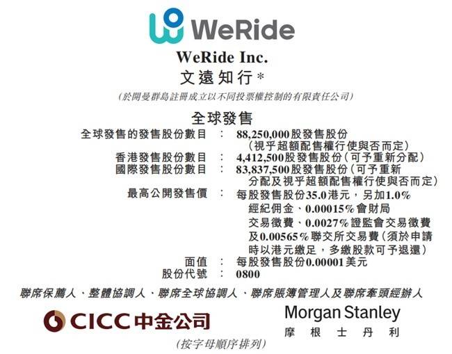 拥有全球最大的L4自动驾驶车队之一,在11个国家超30个城市开展自动驾驶技术落地研发及应用,并 在7个国家拥有自动驾驶牌照,全球Robotaxi第一股文远知行-W(00800)奔赴港股市场。根据灼识咨询 的资料,2024年,以城市道路L4级及以上自动驾驶产生的收入计,文远知行占据21.8%的市场份额。 智通财经APP获悉,10月28日,文远知行发布招股公告,于10月28日-11月3日进行招股,每股最高发售 价为35港元,一手(100股)入场费3,535.3港元,相关股份将于11月6日在联交所上市买卖。 公司预期将向国际承销商授出超额配售权,按国际发售价额外发行及配发最多合共 13,237,500 股发售股 份(约占全球发售项下初步可供认购发售股份数目的 15.0%),如全额行使超额配售,则募资金额预计 将超4亿美元。 本次回港上市,文远知行再次收到全球领先的出行与配送技术平台优步Uber、东南亚领先的超级应用 Grab、全球最大Tier 1博世Bosch等不同产业上下游资方的投资支持,如Uber承诺将进一步投资一亿美 金。据业内人士透露,公司正积极推进上市前路演,且收到不少来自战略投资者和机构投资者较为明确 ...