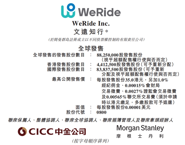 在同步获港股上市备案后,10月28日,小马智行和文远知行几乎同时在港交所发布上市招股书,若顺利挂牌,两者将共同形 成"美股+港股"双重上市格局。 从上市进程看,两家公司步调高度一致,同步启动公开发售,最终于11月6日正式上市交易。此前在2024年,文远知行与小马智 行曾先后赴美上市,角逐"全球Robotaxi第一股"。在这场竞赛中,文远知行于2024年10月25日率先登陆美股,小马智行则紧随其 后,于约一个月后的11月27日在纳斯达克上市。 根据双方此次招股书披露的募资计划,小马智行将发售4195万新股,每股最高发售价180港元,预计募资净额约71.9亿港元;而 文远知行计划发售8825万新股,每股最高发售价35港元,预计募资净额约29.3亿港元。 针对上述情况,《每日经济新闻》记者向两家进一步求证了解,双方均表示:"目前处于静默期,不便多评论"。不过记者注意 到,文远知行创始人兼CEO韩旭已正式签署自愿锁定协议,承诺三年内不减持其持有的公司股份。截至10月28日美股收盘,小 马智行报21.87美元/股,市值为84.26亿美元;文远知行报11.72美元/股,市值为36.66亿美元。 | 全球發售的發售股份數目 ...