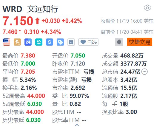 | WRD 文远知行 | | | | --- | --- | --- | | | 7.150 + +0.030 +0.42% | 收盘价 11/19 16:00 美东 | | 7.460 t 0.310 +4.34% | | 盘前价 11/20 04:41 美东 | | | 一 7 24 号 8 8 同 0 0选 | ● 快捷交易 | | 最高价 7.380 | 开盘价 7.050 | 成交量 468.82万 | | 最低价 7.000 | 昨收价 7.120 | 成交额 3377.87万 | | 平均价 7.205 | 市盈率ITM 亏损 | 总市值 24.47亿(…) | | 振 幅 5.34% | 市盈率(静) | 总股本 3.42亿 | | 换手率 2.16% | 市净率 2.692 | 流通值 15.5亿 | | 52周最高 44.000 | 委 比 99.07% | 流通股 2.17亿 | | 52周景低 6.030 | 量 比 0.82 | 色 手 1股 | | 历史最高 44.000 | 股息TTM -- | 换股比率 3.00 | | 历史最低 6.030 | 股息率TM -- 14 | | ...